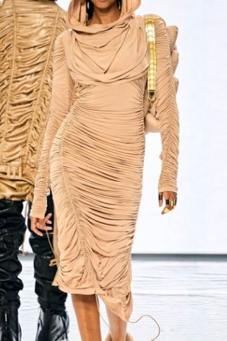 このコレクションの魅力的なポイントです。しなやかな生地に細かくギャザーを寄せて、緩やかなドレープとの絶妙なバランスを表現したドレスや、ルーシングを効かせてスカルプチャーのような立体感を生み出したトップスが印象的です。さらに、積み上げた煉瓦のように整然とキルティングが施されたオーバーサイズアウターは、クラフトマンシップあふれるディテールが目を引きます。